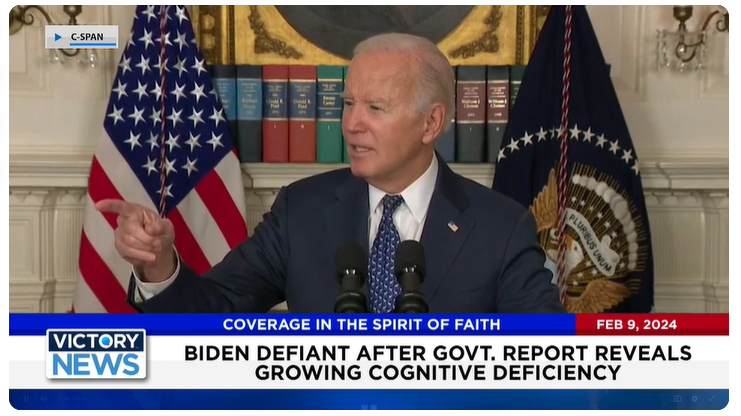 Victory News: 11 a.m. CT | February 9, 2024 – Biden Defiant After Gov’t. Report Reveals Growing Cognitive Deficiency; White House Admits Biden Has Authority Over Border Security