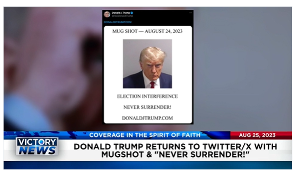 Victory News: 4 p.m. CT | August 25, 2023 – Trump Returns to Twitter/X With Mug Shot and “Never Surrender!”; U.S. House Cmte. Says Joe Biden Lied 16+ Times About Family Business Schemes